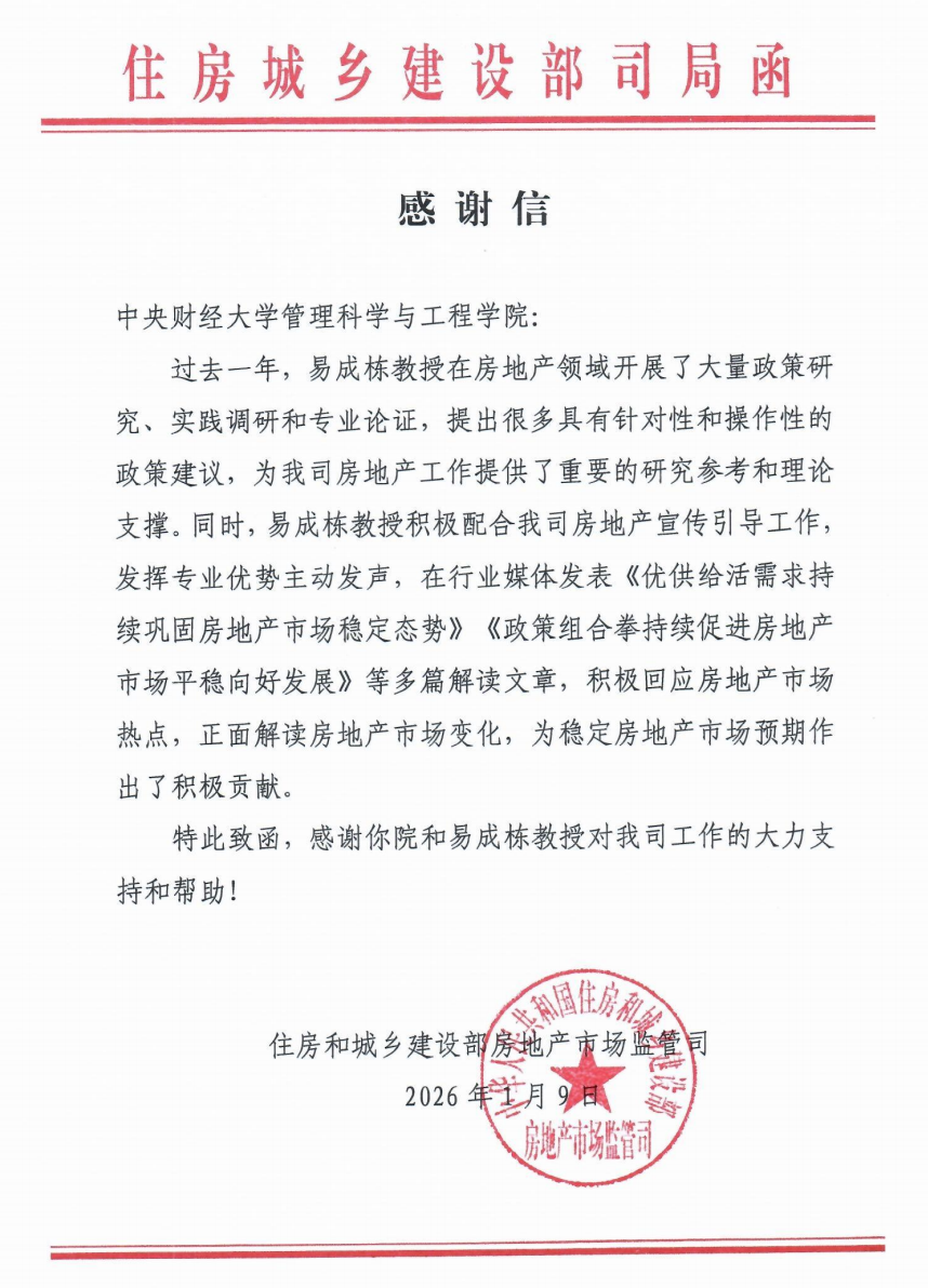 近日,住房和城乡建设部房地产市场监察司向我院发来感谢信,对我院易成栋教授在房地产政策研究和行业解读等方面作出的贡献表示感谢。