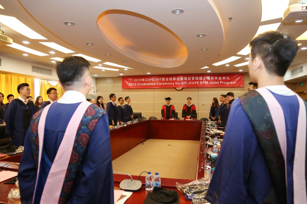 2019年7月6日上午10:00,中央财经大学与美国史蒂文斯理工学院联合培养企业项目管理硕士研究生项目第十二期毕业典礼在中央财经大学学院南路校区学术会堂604会议室成功举行。中央财经大学管理科学与工程学院副院长陈俊华教授,中方教师代表王昊副教授,项目管理老师王勤秋、冯怡,项目第十二期毕业生以及部分毕业生亲友参加了本次毕业典礼。毕业典礼由王勤秋主持。
