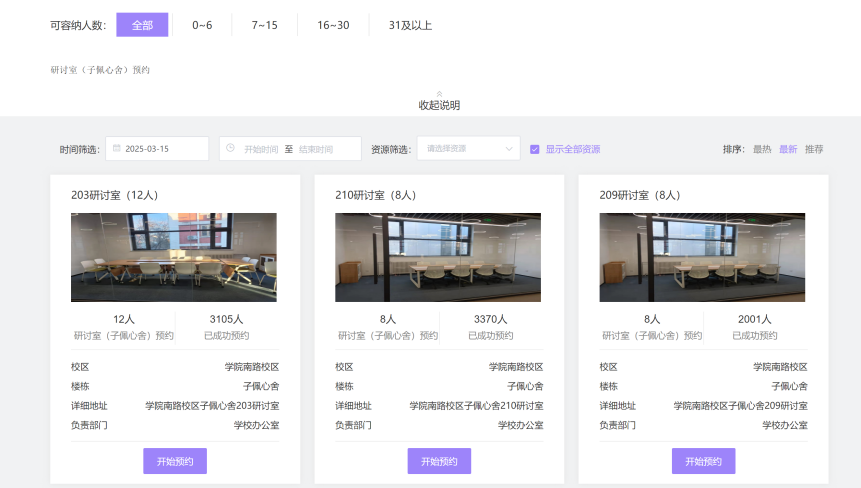 该服务主要应用于学校沙河、学院南路两个校区的面试间申请。点击平台相关栏即可进入预约页面,可以对以下条件进行筛选: