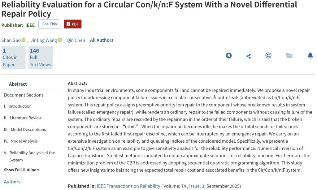 近日,我院王金亭研究团队在中央财经大学AAA期刊《IEEE Transactions on Reliability》发表学术论文“Reliability Evaluation for a Circular Con/k/n:FSystem with a Novel Differential Repair Policy”。高珊教授(阜阳师范大学)为第一作者,王金亭教授为通讯作者,博士生陈芹为共同作者。论文在线链接:https://ieeexplore.ieee.org/abstract/document/10839142。