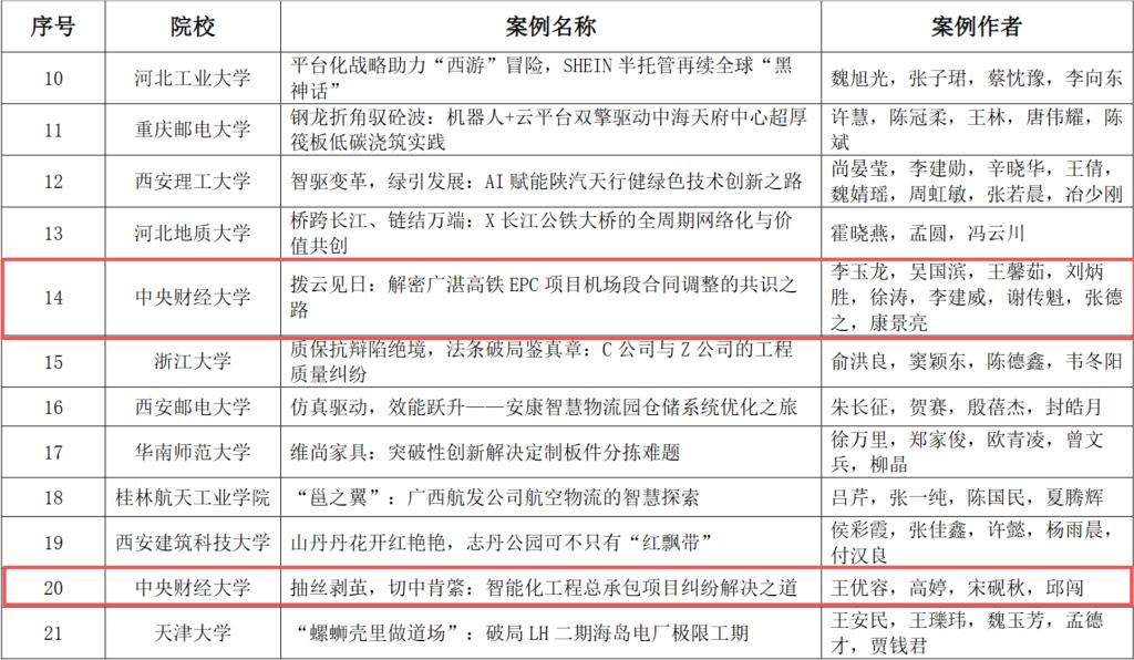 入选案例分别为:李玉龙教授、吴国滨助理教授及合作者共同开发的《拨云见日:解密广湛高铁EPC项目机场段合同调整的共识之路》;王优容副教授、高婷副教授、宋砚秋教授、联合建管(北京)管理咨询有限责任公司董事长邱闯(我院MEM业界导师)共同开发的《抽丝剥茧,切中肯綮:智能化工程总承包项目纠纷解决之道》。
