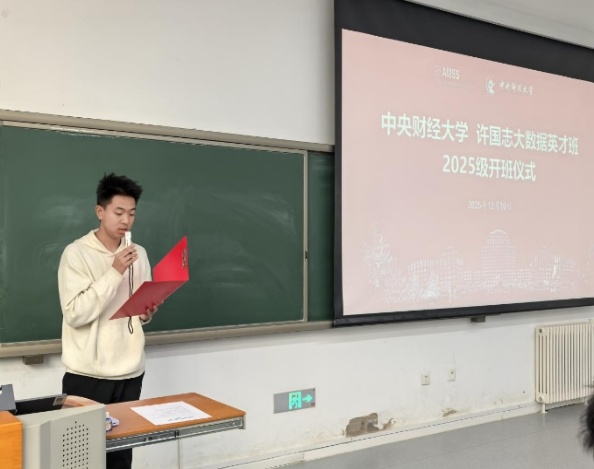2022级许国志大数据英才班刘澍泽作为老生代表发言,他回顾了自己在英才班的学习成长经历,对英才班建设付出的老师们表示感谢,向新生们提出如何做好英才班学生、如何做好一名大学生、如何做好一名中国的知识分子三个问题,并结合自身成长经历给出答案,鼓励学弟学妹们珍惜韶华、勤学笃行。2025级许国志大数据英才班刘恒语作为新生代表发言。他代表全体新生衷心感谢学院精心搭建的优质育人平台,并表示短短百日已深切感受到英才班浓厚的学术氛围与团结奋进的集体凝聚力。面向未来,他郑重表态:始终坚定“数据报国”的理想信念,勇于探索交叉前沿,在时代赋予的使命中砥砺成长,不负青春、不负重托。