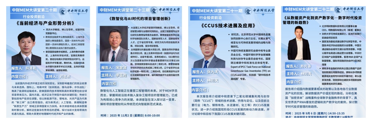 成功举办中财大MEM「投资管理」项目师生论坛暨业界导师聘任仪式、人工智能时代投资管理特色MEM专业硕士人才培养研讨会,邀请业界顶尖专家作高质量主题报告,学院教师与行业专家围绕专硕培养开展深度研讨,并完成业界导师聘任,进一步夯实双导师育人机制。同时,聚焦新背景下人才培养创新路径,深化校企合作内涵,为学员拓展了优质的专家指导资源,切实助力MEM专业硕士人才培养提质增效。