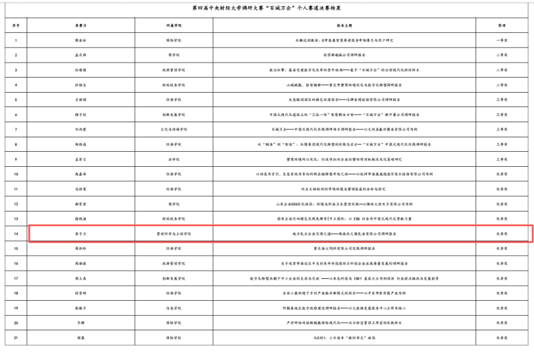 本年组织二十余名MEM学员参与学校“财经人・济世路‘百城万企’中国式现代化实践调研项目”,组队参与专硕案例大赛,以赛促学提升学员实践创新能力,其中1名学员获评第四届中央财经大学调研大赛“百城万企”个人赛道优秀奖。