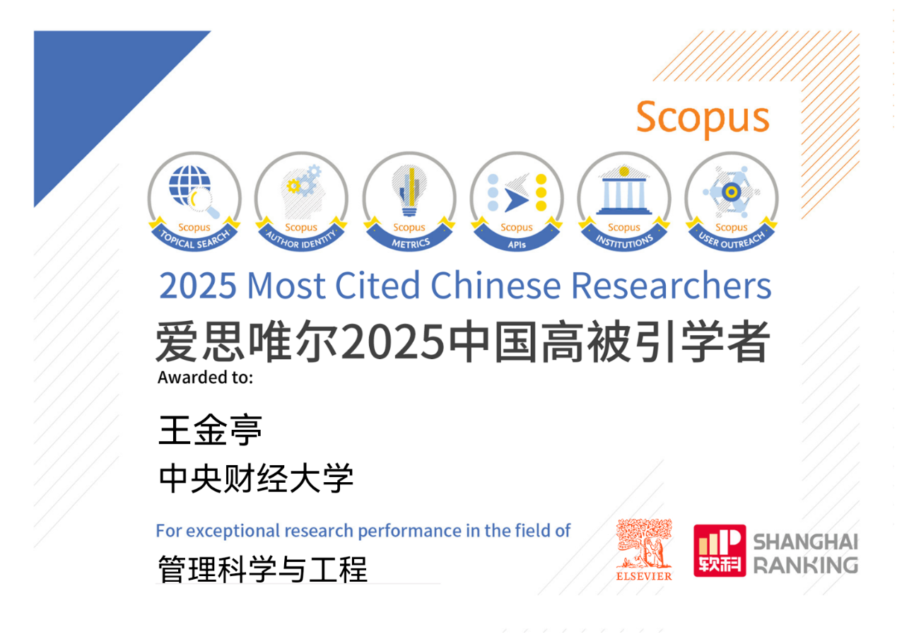 2026年1月30日,国际知名学术出版集团爱思唯尔 (Elsevier)发布了2025“中国高被引学者”榜单,我院王金亭教授再次入选“管理科学与工程”榜单。2021年以来,王金亭教授四次入选爱思唯尔“中国高被引学者”榜单。