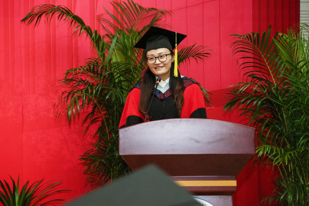 曲红燕老师作为教师代表向全体毕业生寄语。她首先以两个问题引入话题,一是你来中财大做什么?二是你从中财大毕业后要成为什么样的人?然后代表全体教师对学生提出了殷切期望,她希望学生成为心里明白、脑袋清楚、情感丰富以及作风正派的人。