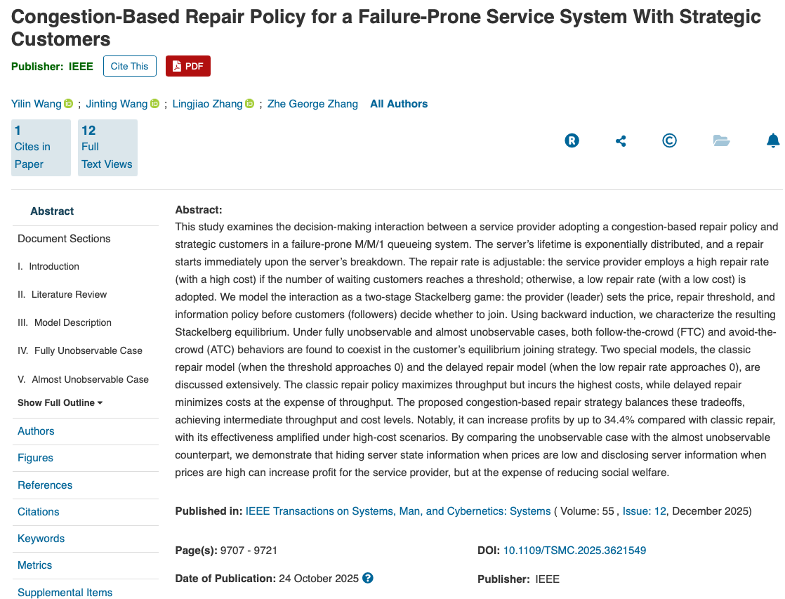 近日,我院王金亭教授团队在中财大AAA期刊《IEEE Transactions on Systems, Man, and Cybernetics: Systems》发表题为“Congestion-Based Repair Policy for a Failure-Prone Service System With Strategic Customers”的学术论文。博士生王忆霖为第一作者,王金亭教授为通讯作者,博士生张铃佼和Zhe George Zhang教授(美国Western Washington University及加拿大Simon Fraser University)为共同作者。论文在线链接:https://ieeexplore.ieee.org/document/11216357。