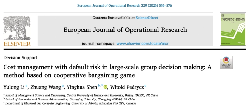 近日,我院李玉龙教授、我院2023级博士研究生王壮、重庆大学申映华副研究员(通讯作者)、加拿大阿尔伯塔大学Witold Pedrycz教授的研究成果“Cost management with default risk in large-scale group decision making: A method based on cooperative bargaining game”在管理科学与工程领域国际权威期刊《European Journal of Operational Research》(EJOR,我校AAA类期刊,ABS 4级期刊)上正式发表,体现了博弈论与决策科学对解决大规模群体决策中现实管理问题的支撑作用,以及多学科交叉融合在应对复杂决策场景中的重要性。论文在线链接:https://doi.org/10.1016/j.ejor.2025.07.047.
