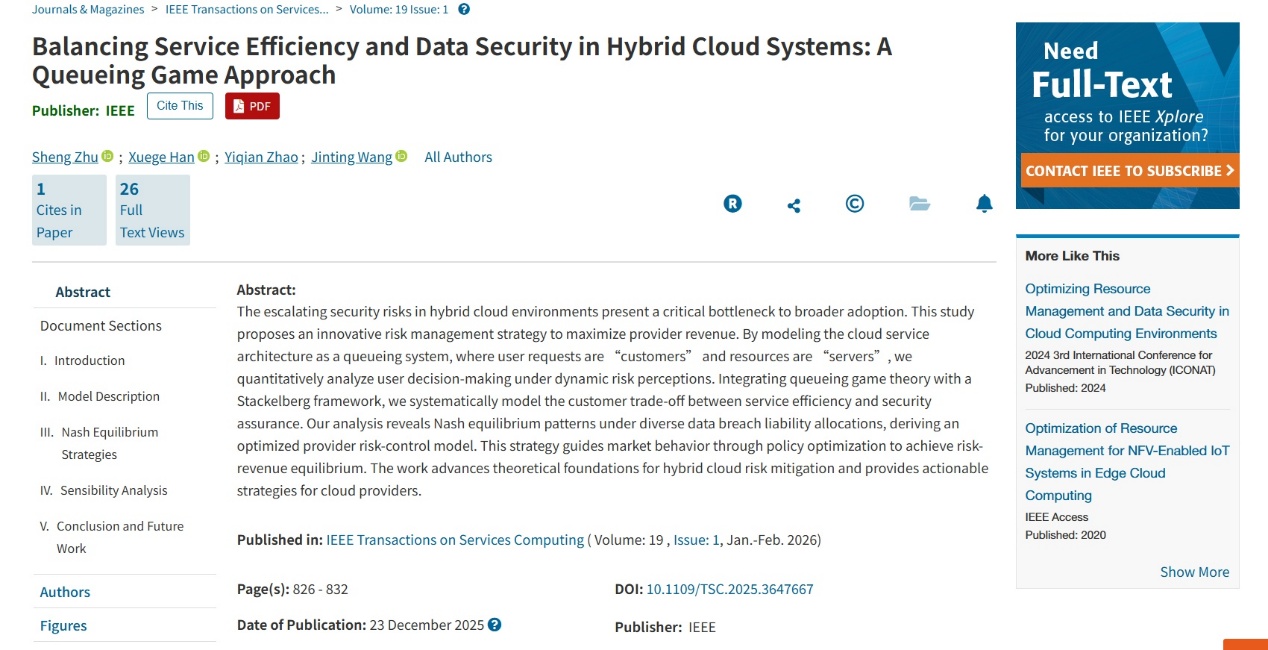 近日,我院王金亭教授团队在中央财经大学AAA期刊《IEEE Transactions on Services Computing》发表题为“Balancing Service Efficiency and Data Security in Hybrid Cloud Systems: A Queueing Game Approach”的学术论文。朱盛副教授为第一作者,王金亭教授为通讯作者,研究生韩雪鸽、赵一潜为共同作者。